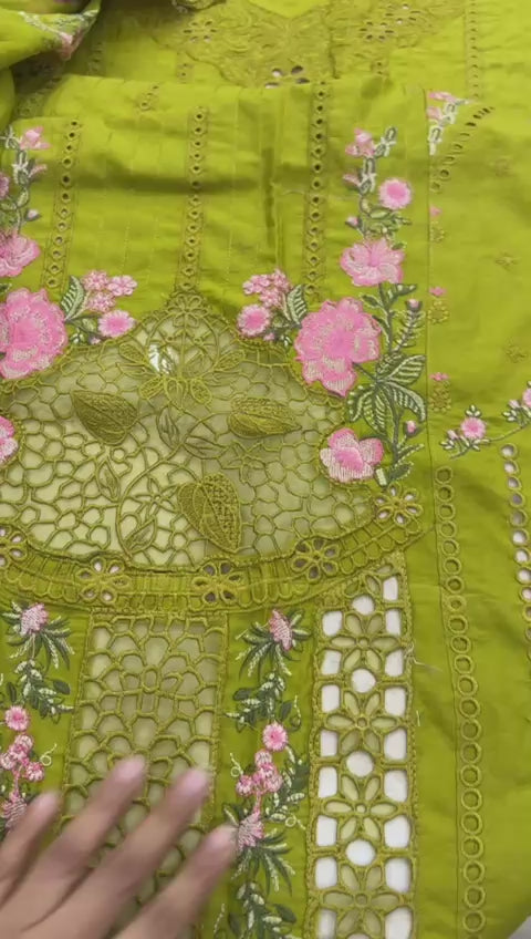 Embroidered Lawn shirt Plain trouser and embroidered Khadi net dupatta