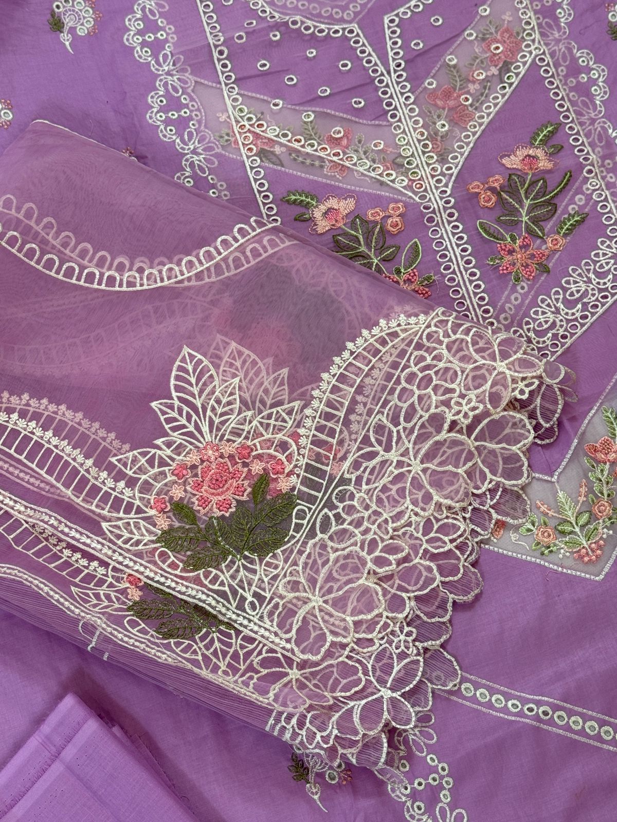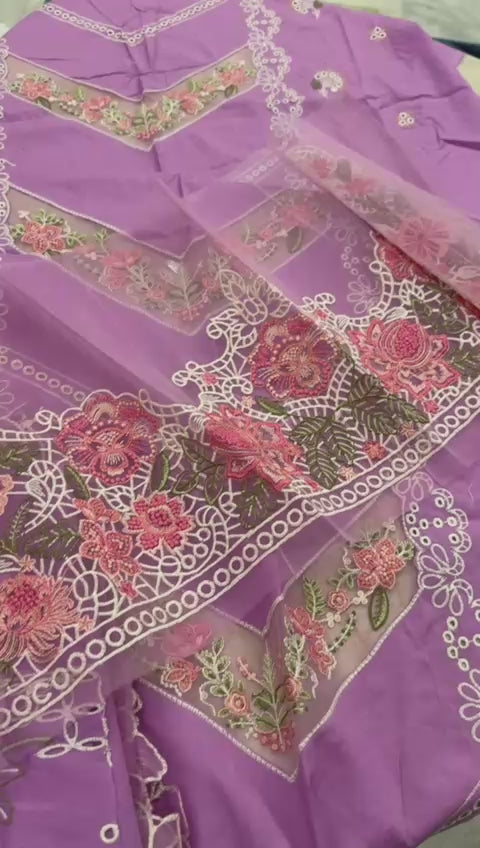 Embroidered Lawn shirt Plain trouser and embroidered Khadi net dupatta