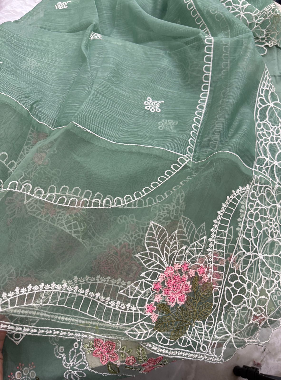 Embroidered Lawn shirt Plain trouser and embroidered Khadi net dupatta
